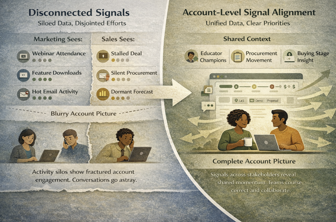 Both teams have data — but neither sees the full account picture. Outreach feels mistimed, and momentum gets misread.
